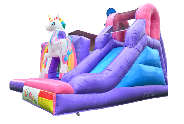 OUR UNICORN BOUNCE AND SLIDE COMBO features fun and fabulous colours, pop up obstacles, internal climbing steps (with an exterior slide) royals to enjoy. One of our most popular jumping castles for first birthday parties, princess parties, fairytale parties and more! It is one of our newest and most popular unit this year. This colorful castle combo is a must have for your next birthday. Size: L-20 x W-20 x H-12 ft Occupancy: 8 -10 kids maximum Recommended age: 1-12 years Power: 1.5kva / 220v/ 1 Blower